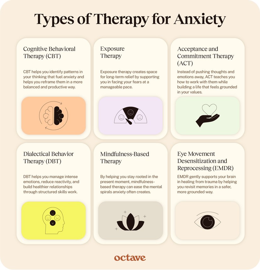 Starting therapy for anxiety is a brave and meaningful step, and it’s okay if you’re not sure exactly what to expect. Octave makes it easier to find the right support by allowing you to filter providers by therapeutic approach, so you can connect with someone who offers the type of care you’re looking for, whether that’s CBT, ACT, EMDR, or another evidence-based method. And if your first therapist isn’t the perfect fit, that’s okay too. Sometimes it takes meeting with more than one provider to find someone you truly connect with.